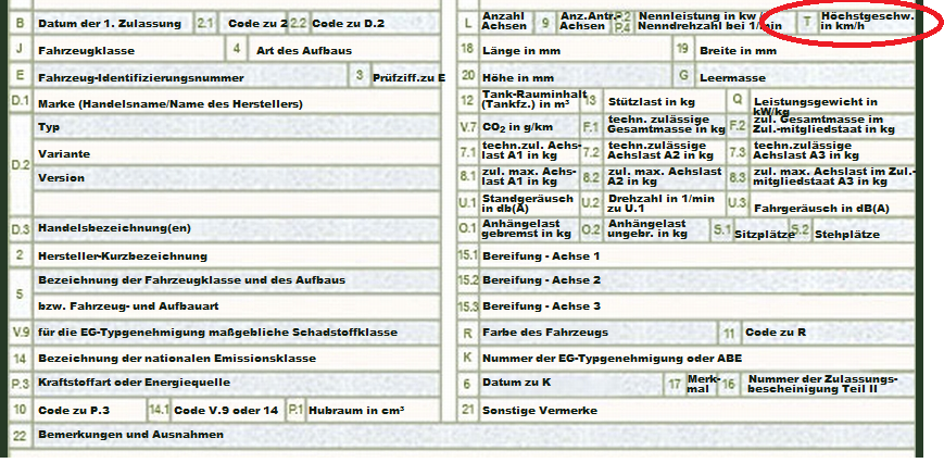 Bei der nationalen Genehmigung muss der Geschwindigkeitsindex des Fahrzeuges aus dem Feld T (bbH = bauartbedingte Höchstgeschwindigkeit) genommen werden. Ist dieser: